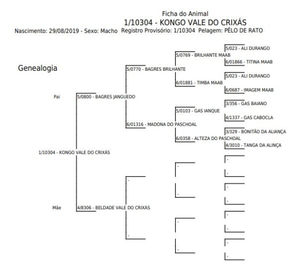 Na linhagem paterna vai aos extraordinários ALI DURANGO e BONITÃO DA ALIANÇA.