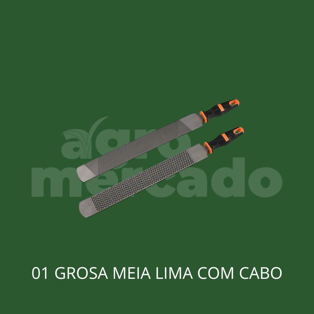 🛠️ 01 Grosa Meia Lima com Cabo: O acabamento perfeito. Desgasta o casco com facilidade para garantir o nivelamento e o apoio correto do animal no solo, aliviando a dor imediatamente.