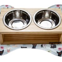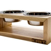 Comedouro Elevado de Madeira: Acompanha duas tigelas de aço inox. A elevação ajuda na postura do pet durante a alimentação, prevenindo problemas digestivos e articulares.