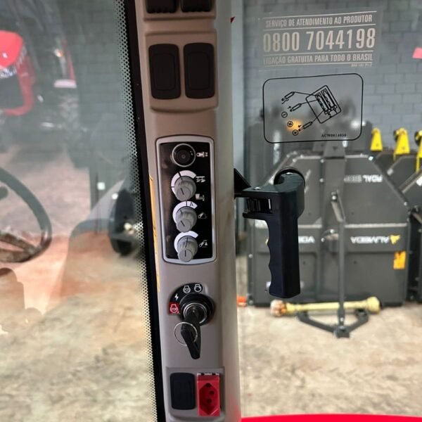 OPERAÇÃO DE PRECISÃO: A Tomada de Força (TDP) com acionamento eletro-hidráulico (por botão) engata o implemento de forma suave, protegendo o equipamento, aumentando a vida útil do cardan e dando total controle ao operador.