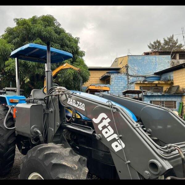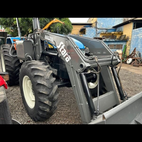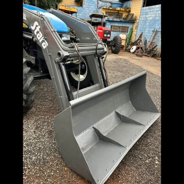 CONJUNTO DE PÁ PREMIUM (STARA): O trator vai equipado com uma Concha Dianteira (Pá Carregadeira) Stara, modelo PAD 750. Este é um implemento de alta performance, robusto e de levante alto, ideal para o carregamento de caminhões, vagões, ou para o trato diário em confinamentos.