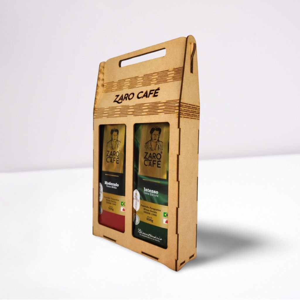 - 01 Sacola em MDF Zaro Café para 2 pacotes de 500g (Código: SMZC2P5) – Embalagem estilosa e resistente, perfeita para presentear.